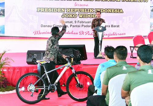 Sambil tersenyum, Presiden Jokowi pun meminta Yusri kembali ke tempatnya dan mengambil sepeda sebagai hadiah. (NVR)