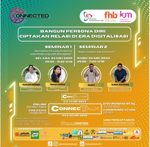 Tangerang Selatan,-Mahasiswa Universitas Pembangunan Jaya (UPJ) Fakultas Humaniora Jurusan Ilmu Komunikasi menggelar acara seminar secara daring dengan judul “CONNECTED 2022”, mengankat tema Bangun Pesona Diri, Ciptakan Relasi di Era Digitalisasi, secara daring atau virtual.
