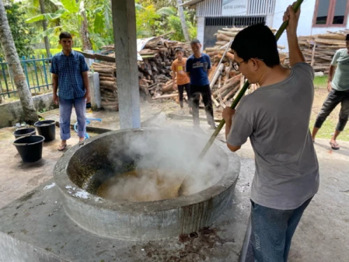 Biasanya sejak pukul 2 siang, dapur umum meunasah Gampong Bueng Bakjok yang dibangun tanpa dinding itu sudah ramai dengan aktivitas memasak dengan menggunakan belanga besar berukuran 1,3 meter yang mengeluarkan kepulan asap dan aroma harum rempah-rempah.